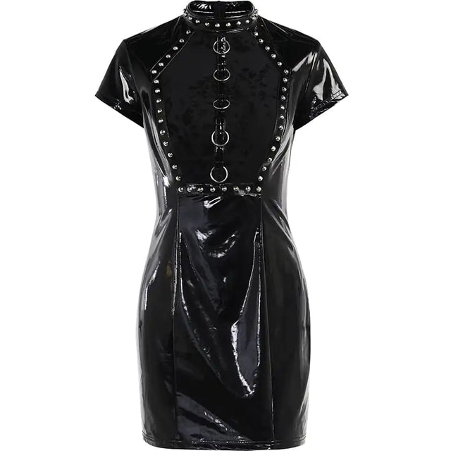 Crafted from high-quality Nylon with a chic leather finish, this dress features exquisite flocking stitching and edgy rivet detailing that makes it perfect for a variety of occasions. Whether you're dressing up for a night out or adding flair to your everyday look, this dress will ensure you stand out from the crowd.